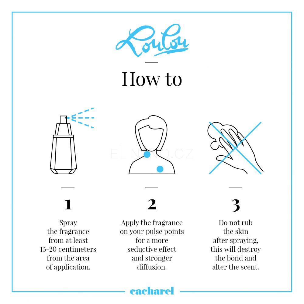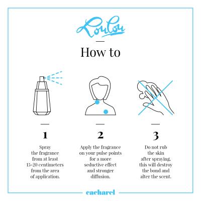 Vůně se otevírá kompozicí něžného aromatu květin, vůní šťavnatého ovoce a kořenitých akordů, které vytváří jiskřivé úvodní tóny. Ty jsou posléze vystřídány vůní, jež voní jako náruč těch nejkrásnějších květin. Květiny, které se ukrývají v srdci parfémované vody, zdobí hřejivé santalové dřevo, vůně kadidla, benzoinu, svůdné pižmo a dechberoucí sladká vůně vanilky. Parfémovaná vody Cacharel Lou Lou se stane vaším okouzlujícím doplňkem především do chladnějších dnů. Nebojte se zahalit své tělo vůní, která si vyslouží pozornost okolí.