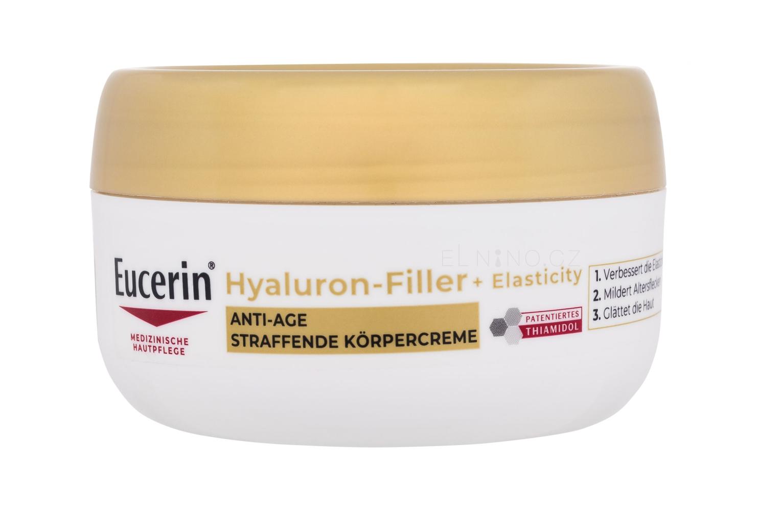 Eucerin Hyaluron-Filler + Elasticity Anti-Age Body Cream přináší inovativní řešení pro tři hlavní potřeby stárnoucí pokožky: zlepšení pružnosti, redukci pigmentových skvrn a intenzivní hydrataci.