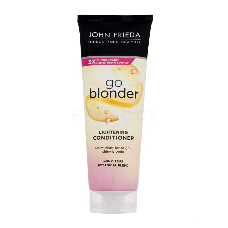 Kondicionér pro zesvětlení vlasů John Frieda Sheer Blonde Go Blonder prodlužuje životnost barvy vlasů, zesvětluje ji a prozáří. Dodává oslnivý lesk a objem. Intenzivně hydratuje a vyživuje pro krásné a vitální vlasy. Po použití se vlasy snadno rozčesávají a upravují.